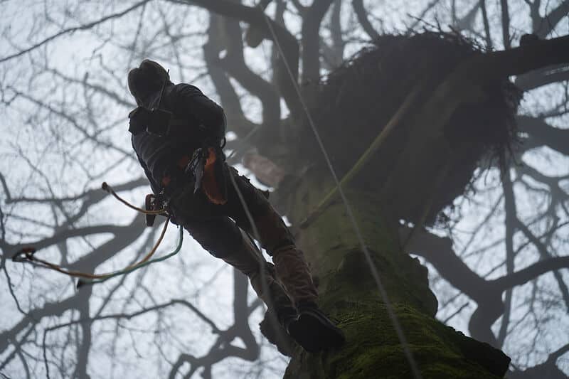 Für die Montage der Technik ging es hoch hinaus: Der Baumkletterer Joachim Neumann brachte die Kameras in alten Buchen in luftiger Höhe an. Zusätzlich wurden an den Baumstämmen ein Kletterschutz gegen Waschbären installiert, diese verhindern, dass Nesträuber zu den Horsten gelangen.
